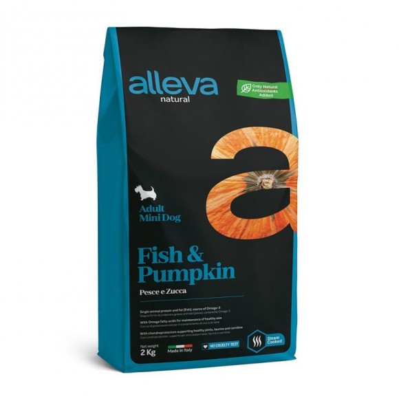 Croquettes Super Premium complètes Alleva Natural Poisson & Potiron pour chien adulte de petite race.