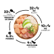 Viande de poulet et de dinde déshydratée* (33 %), Riz blanc* (32 %), Graisse de poulet et de dinde*, Riz complet* (10%), Petits pois entiers* (4%), Pulpe de betterave déshydratée* (4%), Poulet hydrolysé* (3%), Minéraux, Levure de bière*, Pulpe de pomme déshydratée* (0,5%) (équivalent à 4,3% de pommes fraîches), Postbiotiques* (Produits inactivés de fermentation de la levure de bière) (0,20%), Chondroïtine (900 mg/kg), Glucosamine (813 mg/kg), Yucca schidigera*. *Ingrédients naturels.