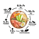 Protéines: 25%,  Matières grasses: 16%,  Matières inorganiques: 7,5%,  Cellulose brute: 3,4%