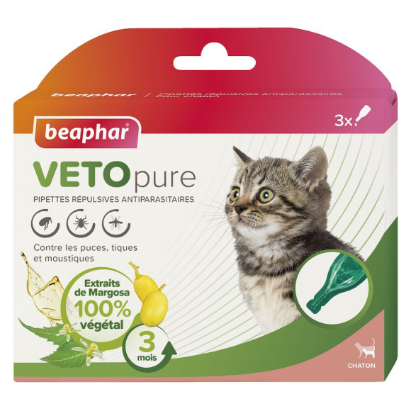 La gamme Vetopure de Beaphar est efficace contre les puces, les tiques et les moustiques. Les pipettes Vetopure pour chaton ont été spécialement conçues pour repousser les parasites externes. Elles contiennent des extraits d'origine végétale de Margosa (Neem), arbre reconnu pour ses propriétés répulsives contre les insectes. En cas d’infestations massives, il est conseillé de traiter l’environnement de l’animal et l’habitat avec un insecticide de la gamme Vetopure de Beaphar, comme le spray, le pulvérisateur et les diffuseurs automatiques insecticides habitation. Ingrédients : Extraits de Margosa (cas n° 84696-25-3) 50 g/L, Ethyl Butylacetylaminopropionate (cas n° 52304-36-6) 50 g/L, excipients qsp 1L.