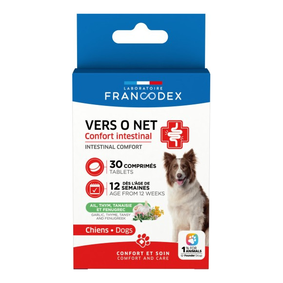 Les chiens peuvent être soumis à des stress, des changements alimentaires ou des agents agresseurs entrainant des problèmes intestinaux. Les comprimés VERS O NET FRANCODEX contiennent des plantes (ail, thym, tanaisie et fenugrec), ainsi que des oligo-éléments, pour participer au confort intestinal de votre chien et renforcer ses défenses naturelles.